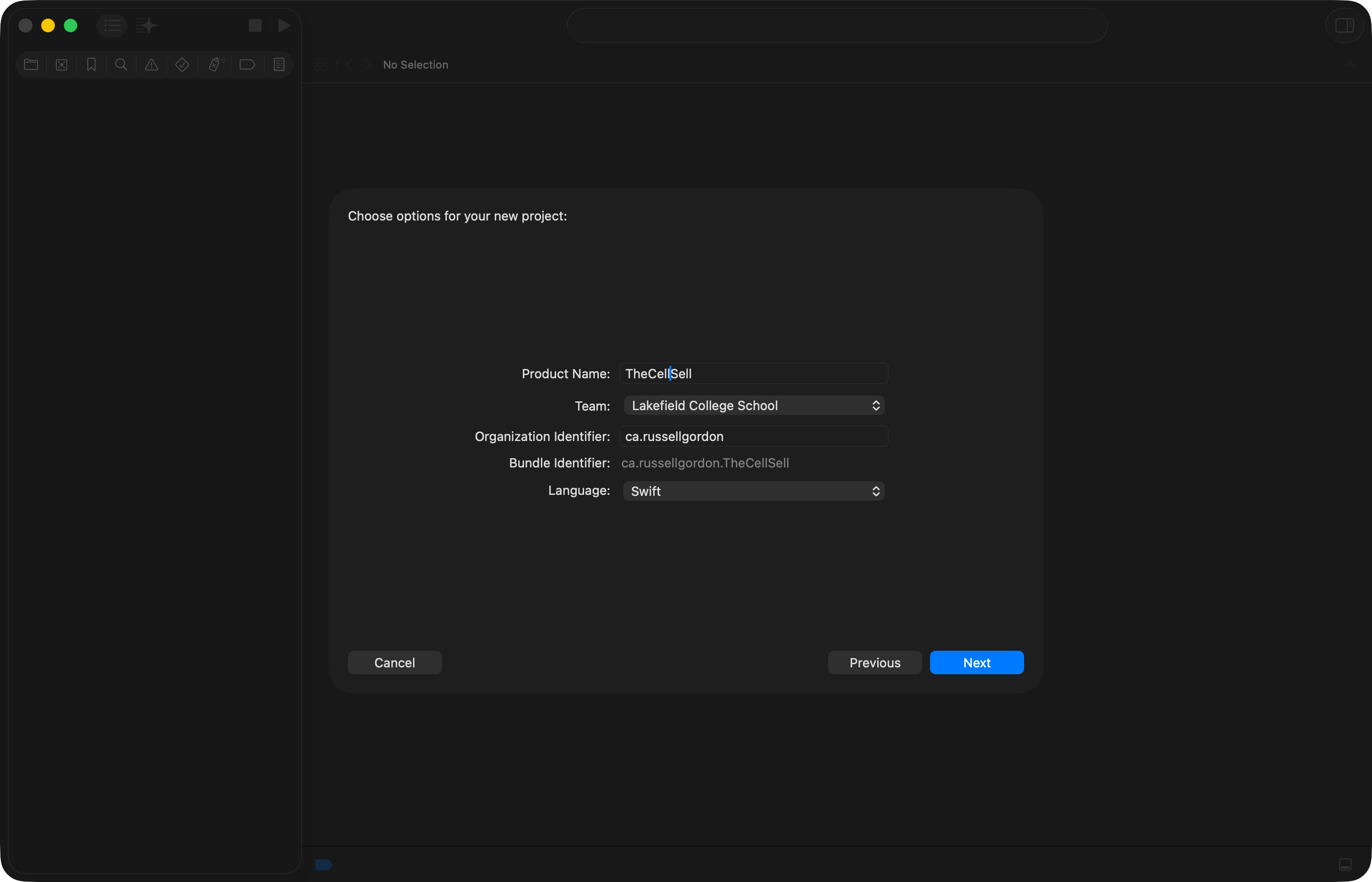 russellgordon.ca. Typically, software developers choose an organization identifier that is their website domain, reversed. So, Mr. Gordon would typeca.russellgordonfor the organization identifier. Neil Shah might useca.neilshah, which is totally acceptable, even if Neil doesn’t actually own theneilshah.cadomain name. - For the language, choose Swift.