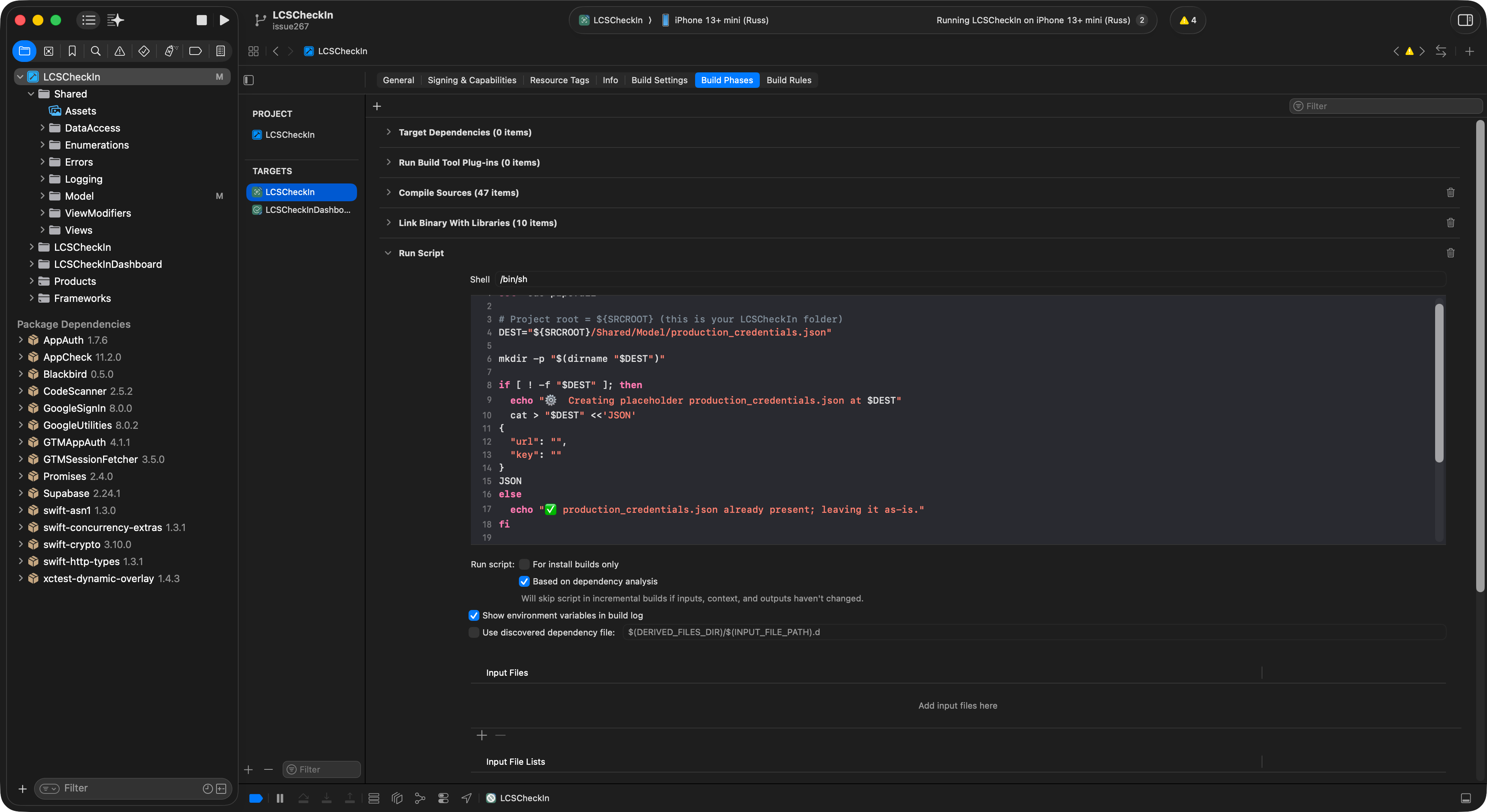 The LCS Check In project uses Swift and SwiftUI to build client-side apps with a DatabaseConnection class that selects the DB based on the build configuration: