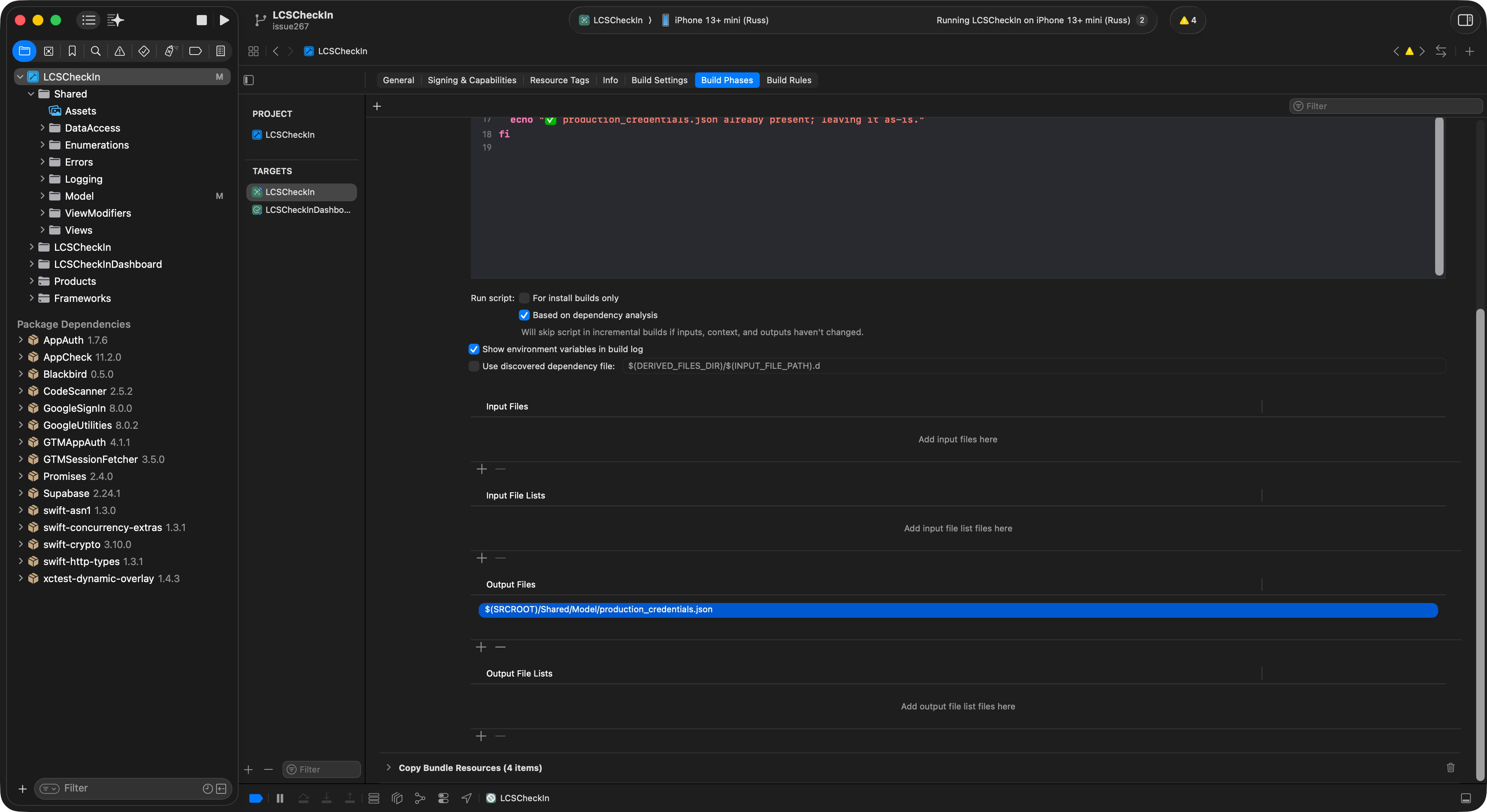 Because the production JSON file is not in Git (by design) and lives only on the Mr. Gordon’s computer, your builds – student builds – failed because Xcode couldn’t find production_credentials.json referenced in the Copy Bundle Resources step of the build phase of the project: