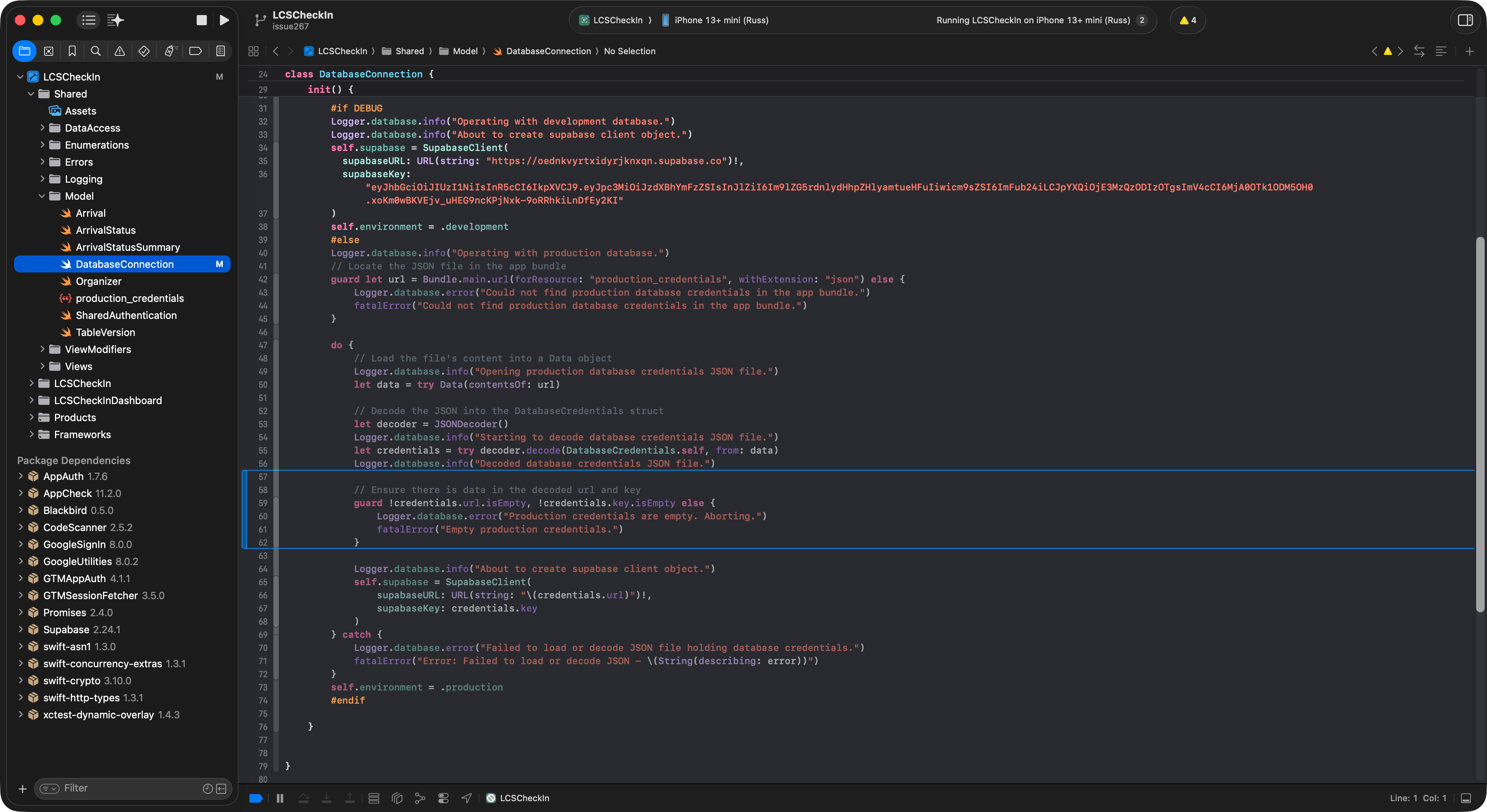 Finally, a runtime guard was added to the Release path in the DatabaseConnection class so that the app refuses to run with empty production credentials: