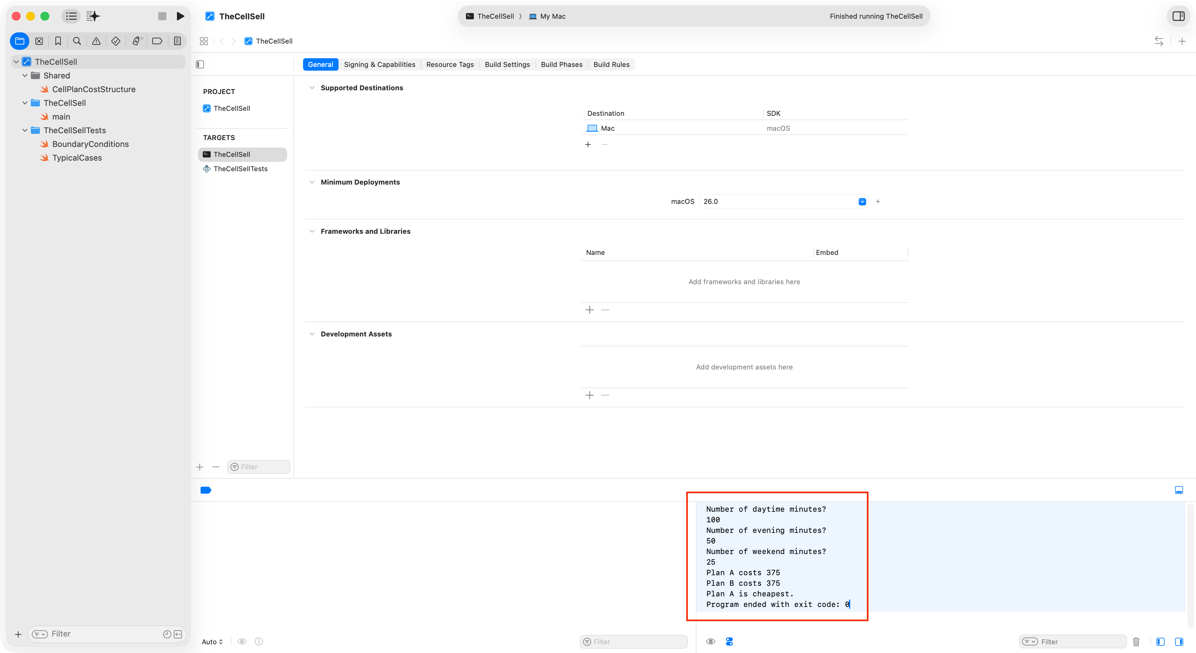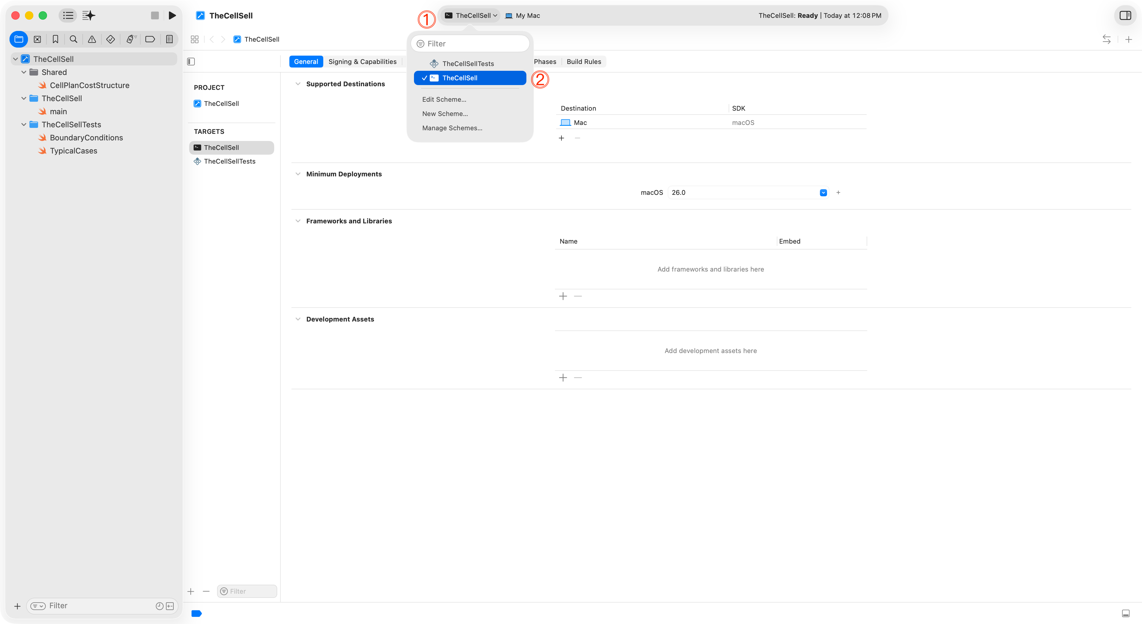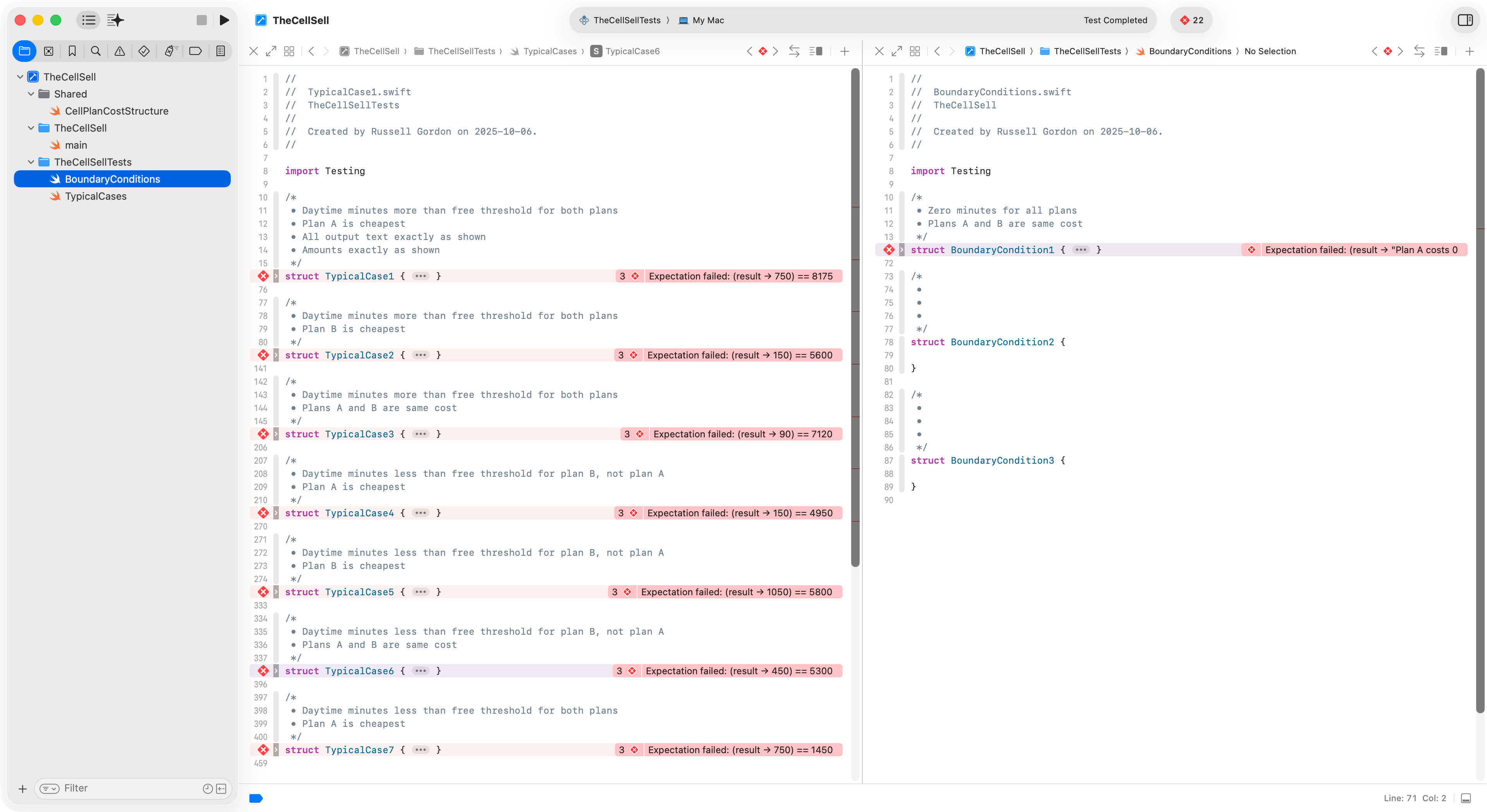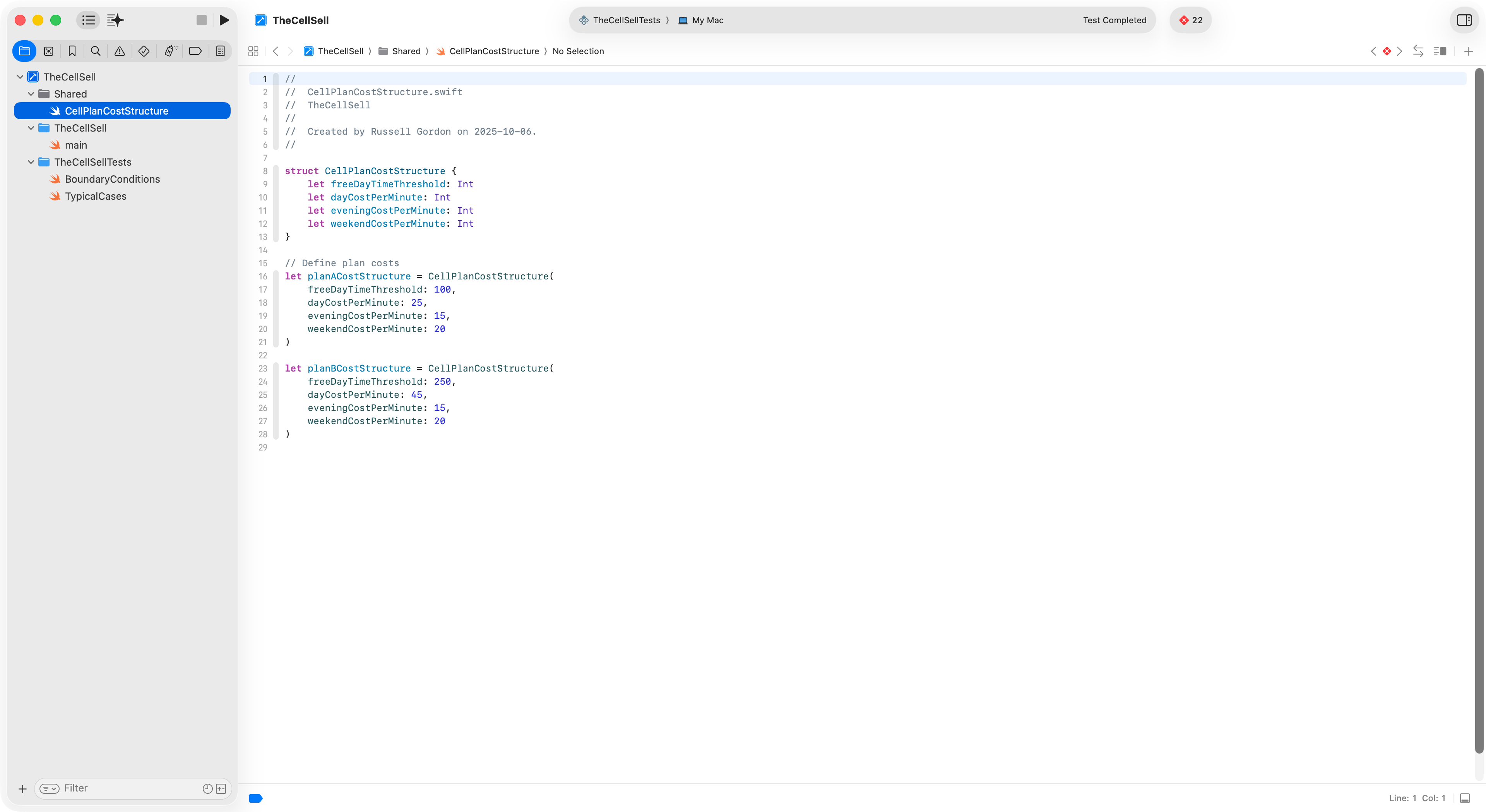 Be selecting TheCellSellTests scheme, following this two-step click process, then pressing Command-U, you can run all of the defined unit tests: