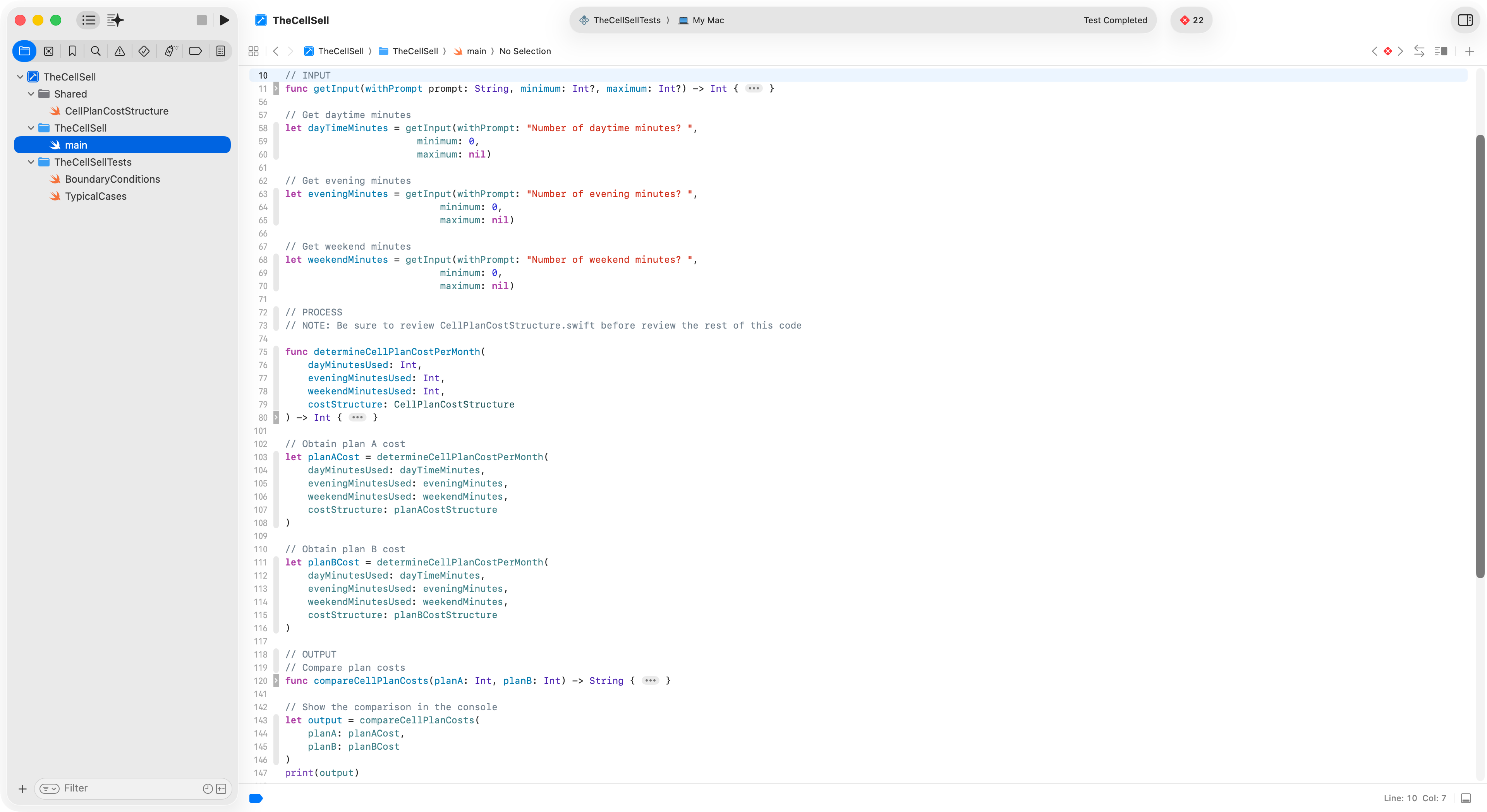 The program logic resides in main.swift – notice how logic has been compartmentalized into functions for the input, process, and output portions of the program: